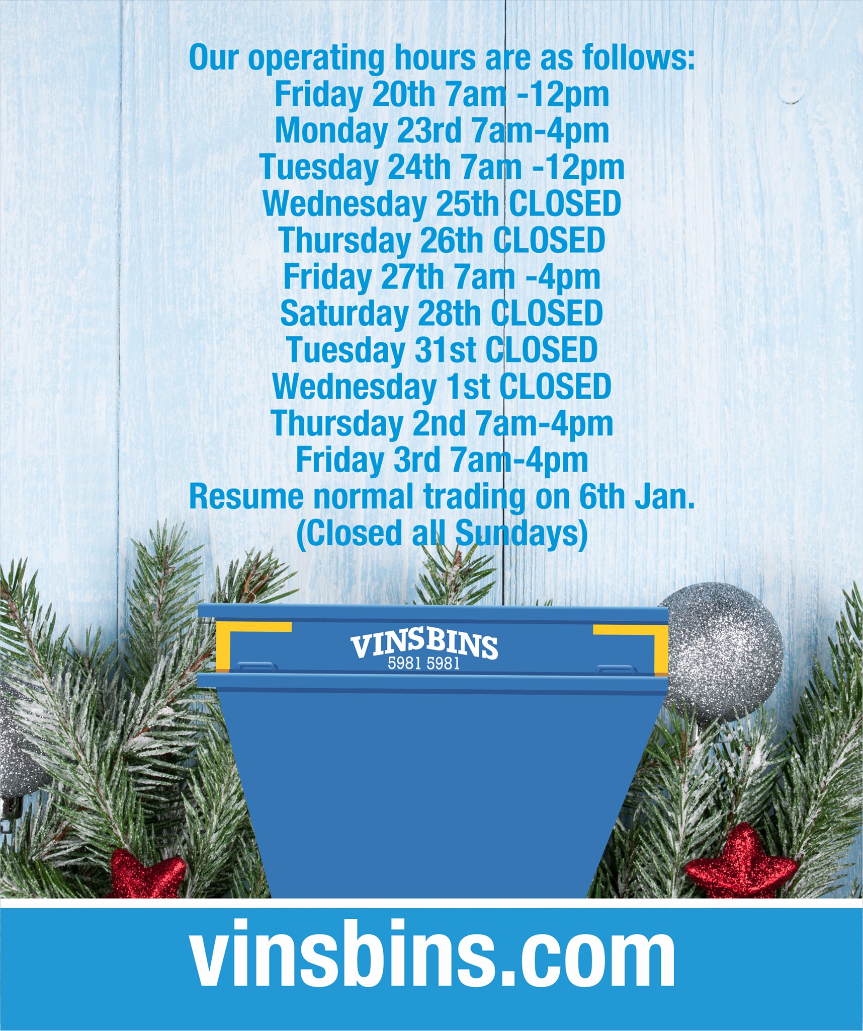 PLEASE NOTE THE BELOW VINSBINS CHRISTMAS / NEW YEARS OPERATING HOURS. Wishing